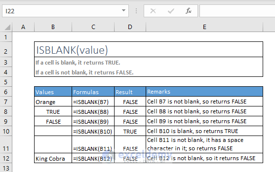 If a cell is blank, it returns TRUE. If a cell is not blank, it returns FALSE.