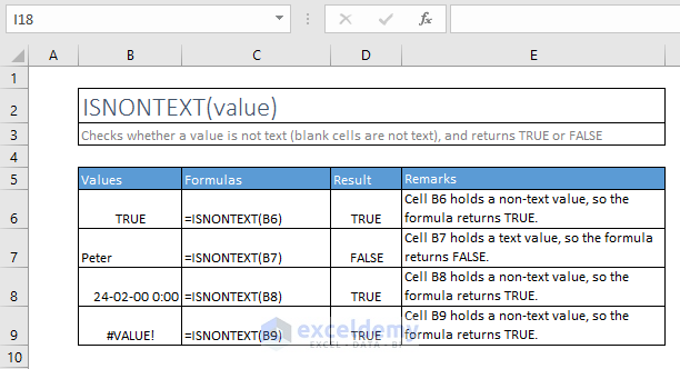 Checks whether a value is not text (blank cells are not text), and returns TRUE or FALSE