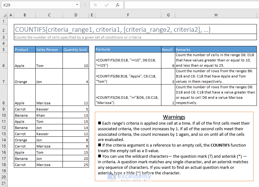 =COUNTIFS(criteria_range1, criteria1, [criteria_range2, criteria2], …)