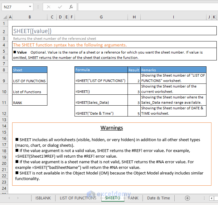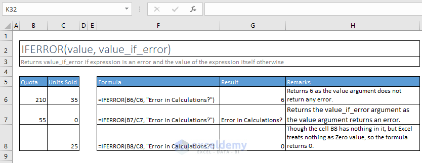 Checks whether a value is an error (#N/A, #VALUE!, #REF!, #DIV/0!, #NUM!, #NAME?, or #NULL!), and returns TRUE or FALSE