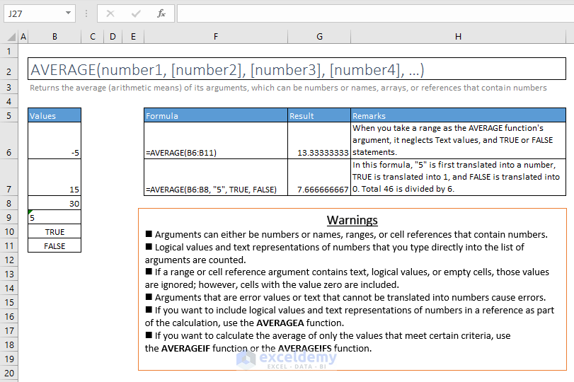 =AVERAGE(number1, [number2], [number3], [number4], …)