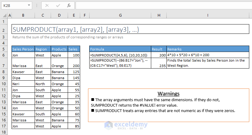 =SUMPRODUCT(array1, [array2], [array3], …)