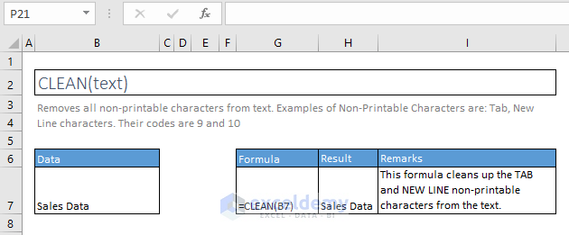 Removes all non-printable characters from text. Examples of Non-Printable Characters are Tab, New Line characters. Their codes are 9 and 10.