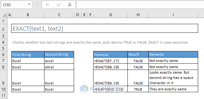 Checks whether two text strings are exactly the same, and returns TRUE or FALSE. EXACT is case-sensitive