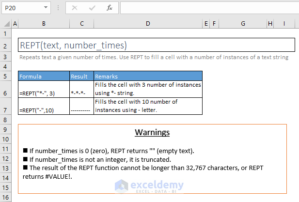 Repeats text a given number of times. Use REPT to fill a cell with a number of instances of a text string