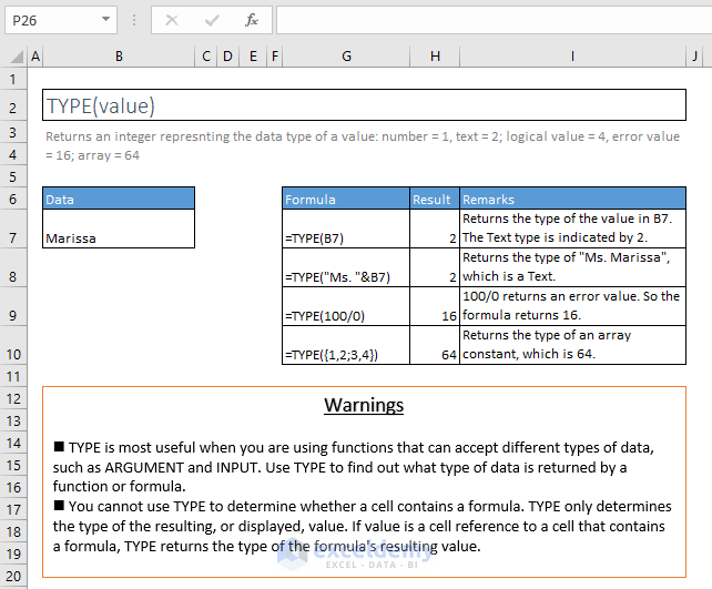 Returns an integer represnting the data type of a value: number = 1, text = 2; logical value = 4, error value = 16; array = 64